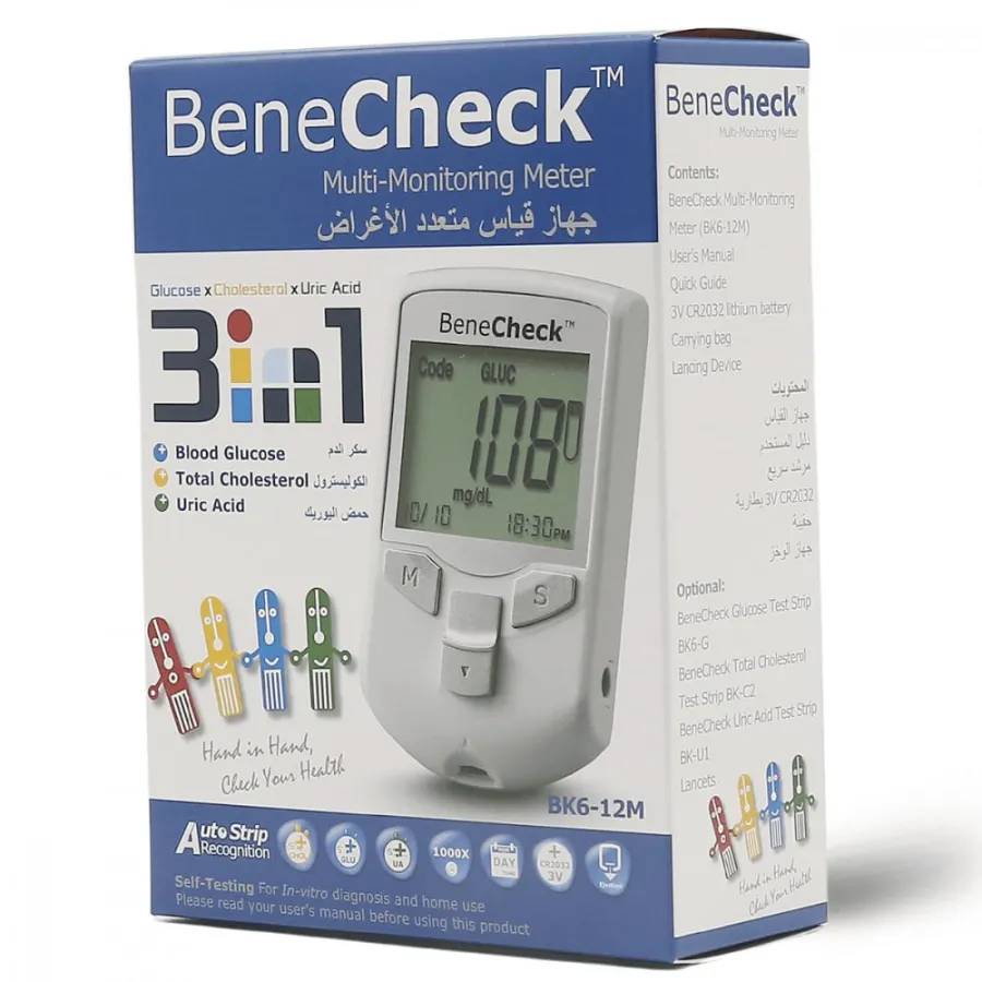 جهاز BeneCheck Multi-Monitoring Meter هو جهاز قياس متعدد الأغراض يستخدم لمراقبة مستويات السكر في الدم، الكوليسترول الكلي، وحمض اليوريك.